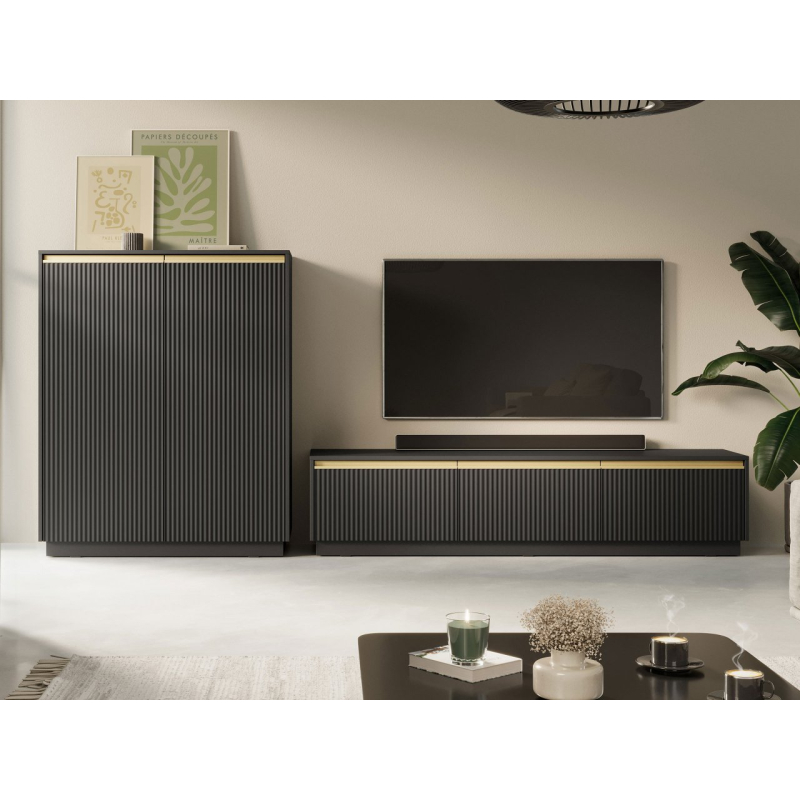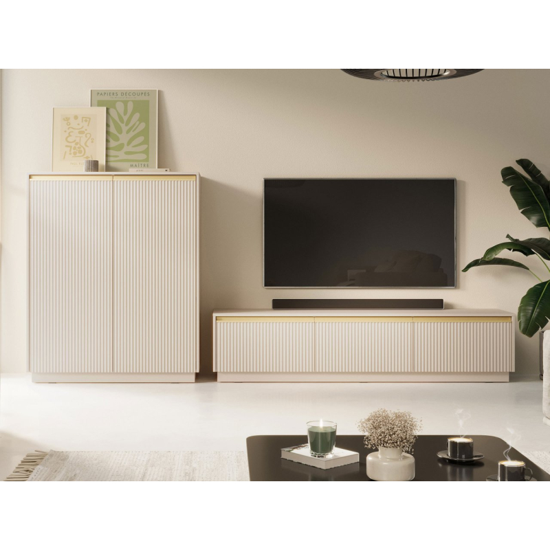Moderní nábytek do obývacího pokoje zaujme svým vzhledem. Frézovaná čela jsou kombinována se zlatým akcentem, což dodává celku stylový charakter. Souprava dokonale zapadne do moderních a okouzlujících aranžmá.