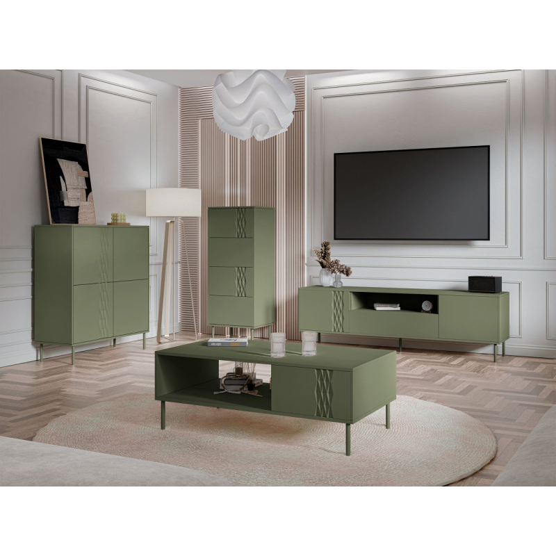 RTV skříň na nožičkách vám umožní uspořádat si multimediální vybavení a zároveň zobrazit to, co je pro vás důležité. Celek doplňuje elegantní konferenční stolek – dokonalý společník pro večerní rozhovory, oblíbená kniha a šálek aromatické kávy.