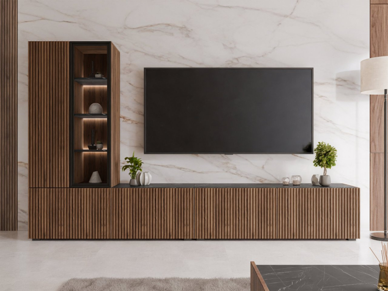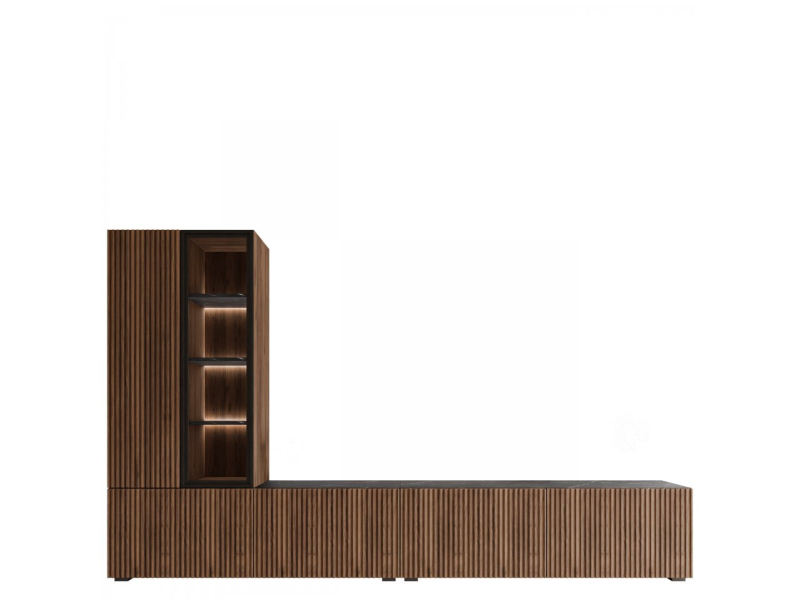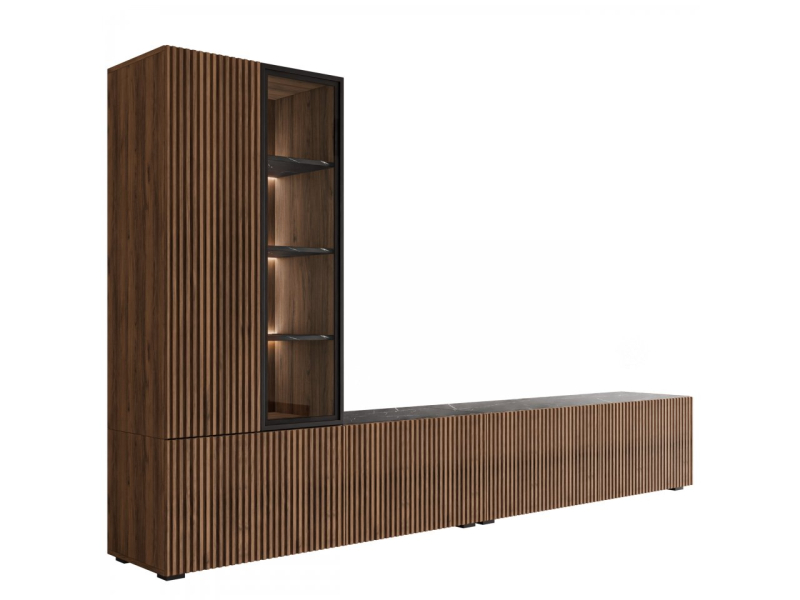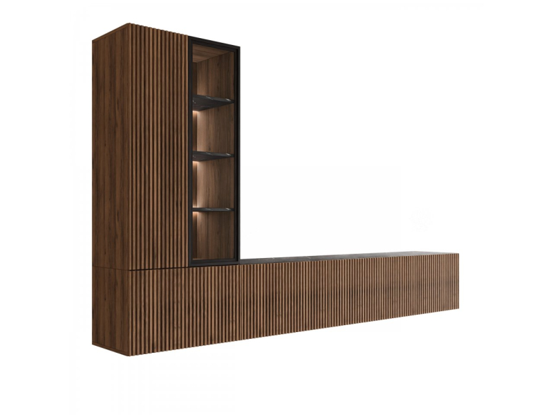 Všestranný design umožňuje montáž na zeď i na podlahu. Prosklené prvky jsou vyrobeny z průhledného, bezbarvého tvrzeného skla. Energeticky úsporné bílé LED osvětlení doplňuje skříňku a decentně zdůrazňuje její moderní charakter.