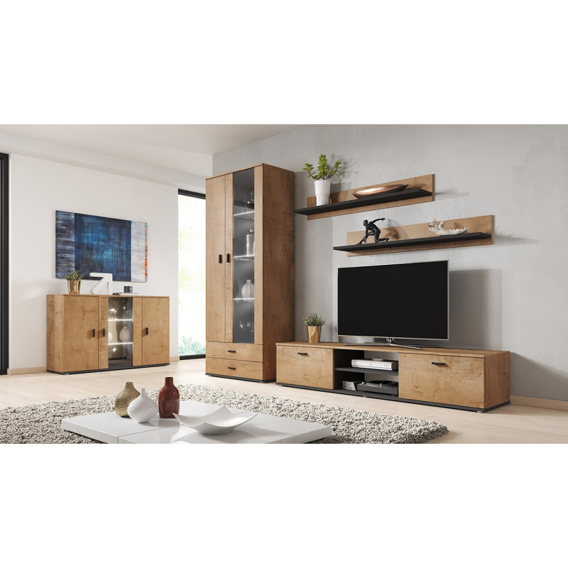Boho IX se skládá z několika prvků. Prvním je TV stolek, který má dvě skříňky a police uprostřed. Obývací pokoj vždy potřebuje místo na vystavení vašeho oblíbeného nádobí nebo suvenýrů z dovolené. K tomuto účelu je k dispozici vysoká vitrína s jedním skleněným čelem a komoda, která má také částečně prosklená přední dvířka. Posledním prvkem sady jsou dvě závěsné police.