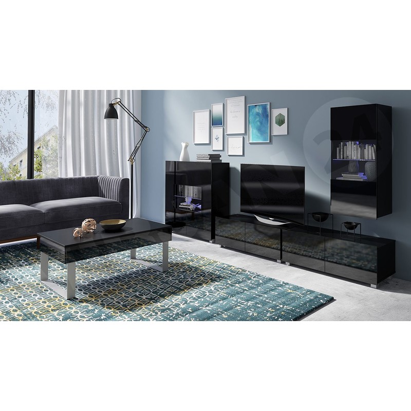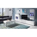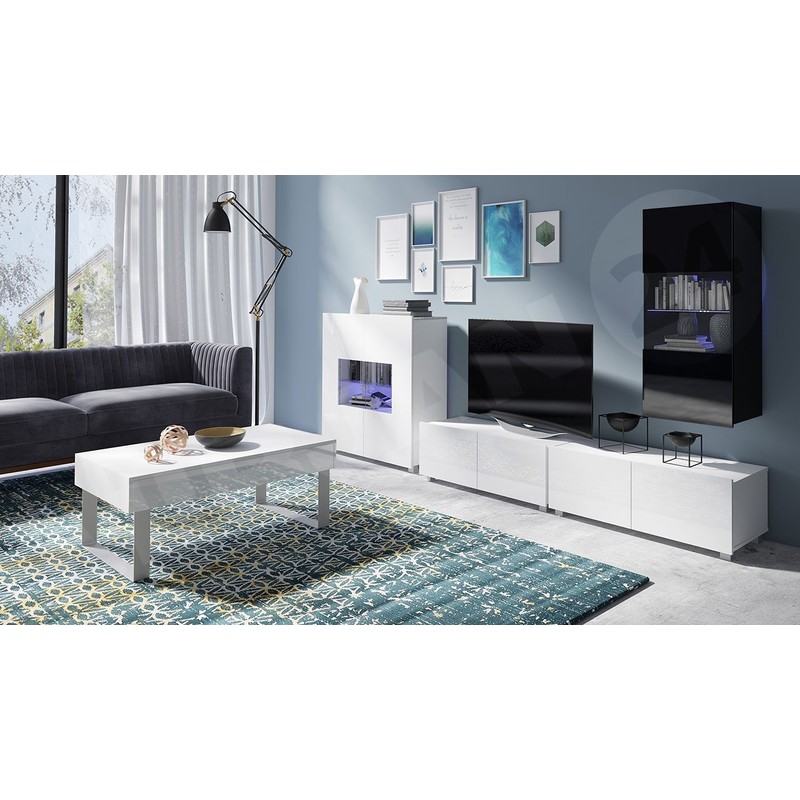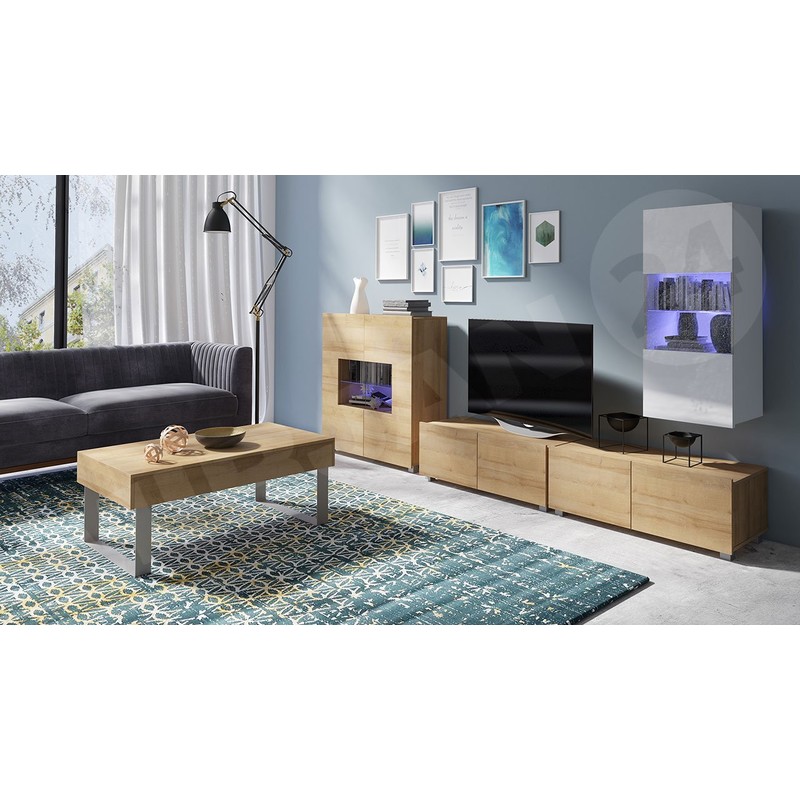 Vítejte ve světě krásných interiérů zdobených prostornou nástěnnou jednotkou Bralani XXII. Funkční, prostorná a pevná nástěnná jednotka ozdobí i minimalistické uspořádání. Módní barevná paleta usnadňuje přizpůsobení nábytku interiéru. Sada obsahuje: moderní komodu a zavěšenou skleněnou skříňku. Částečné zasklení předních částí tohoto nábytku vám umožní působivě zobrazit vaše oblíbené doplňky a dekorace. Televizní skříň se vyznačuje jednoduchým designem a maximální kapacitou police. Perlou soupravy je moderní konferenční stolek. Jednoduchý tvar a geometrické tvary lavice dokonale ladí se sadou a vytvářejí ucelený celek. Zdůrazněte hodnotu svého uspořádání a vybavte nástěnnou jednotku módním LED osvětlením, které do vašeho interiéru přinese jemnou glamourovou záři.