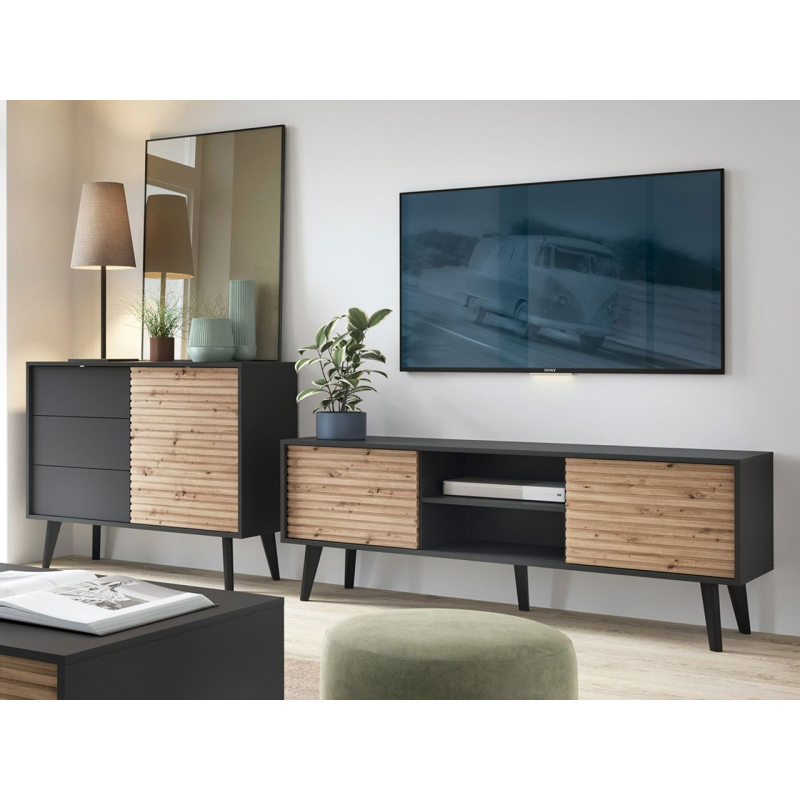 Celá sestava dodá místnosti hřejivý, útulný tón. To je dáno jejím designem. Subtilní nožky, originální frézování a motiv dřeva napomáhají modernímu a loftovému uspořádání.