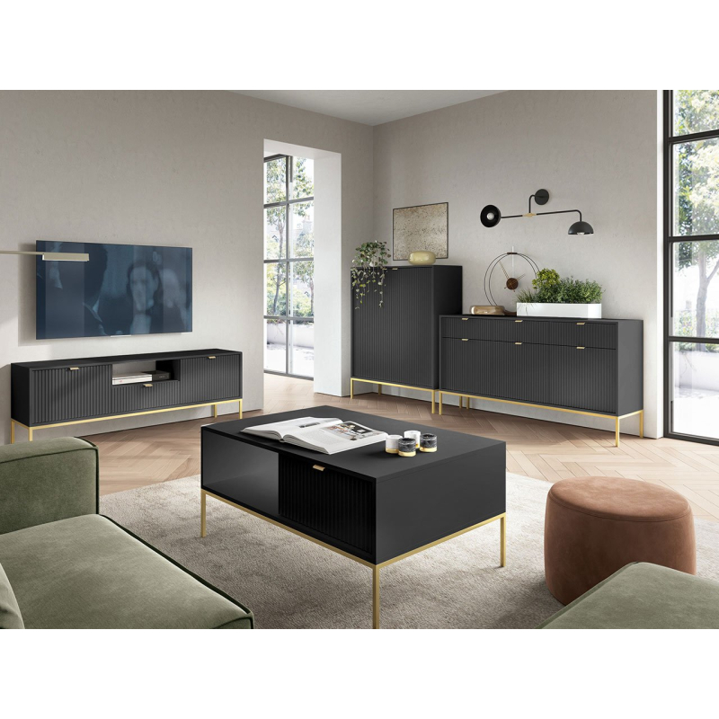Souprava nábytku do obývacího pokoje okouzlí svým jedinečným vzhledem a prestižním charakterem. Tato souprava se zlatými úchytkami a nožkami a s frézovaným dekorem je skutečným mistrovským dílem mezi interiérovými doplňky. Skládá se z TV stolku, konferenčního stolku, vysoké komody a široké komody, které spolu harmonicky ladí. Splní očekávání i těch nejnáročnějších milovníků luxusu a elegance.