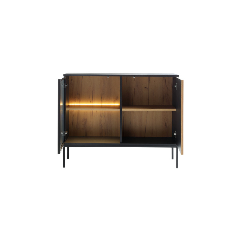 Minimalistický design komody do obývacího pokoje podtrhuje modernistický styl nábytku v pokoji. Díky systému otevírání "PUSH TO OPEN" se dvířka otevírají jemně a plynule. Přídavné LED osvětlení, dodává interiéru jedinečnou atmosféru a odhaluje uložené předměty. Vysoká vitrína nabízí dostatek prostoru pro uložení dekorativních předmětů, jako je nádobí, suvenýry z dovolené nebo oblíbená sbírka knih. TV skříňka uklidí prostor v prostoru s televizí. Vejdou se do ní všechny káble, disky a elektro vychytávky. Má také otevřenou polici pro set-top box nebo herní konzoli.