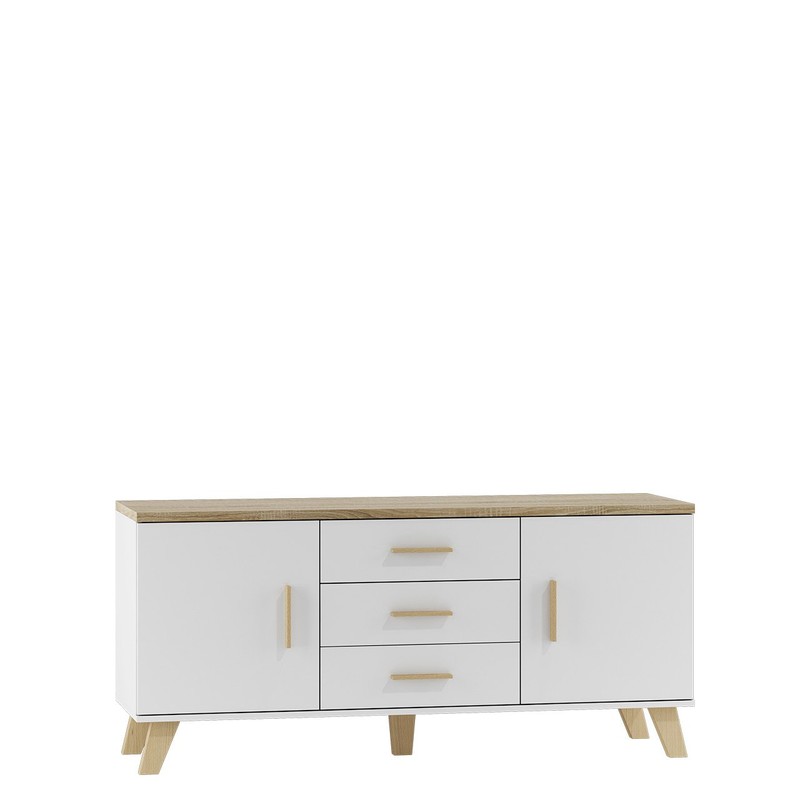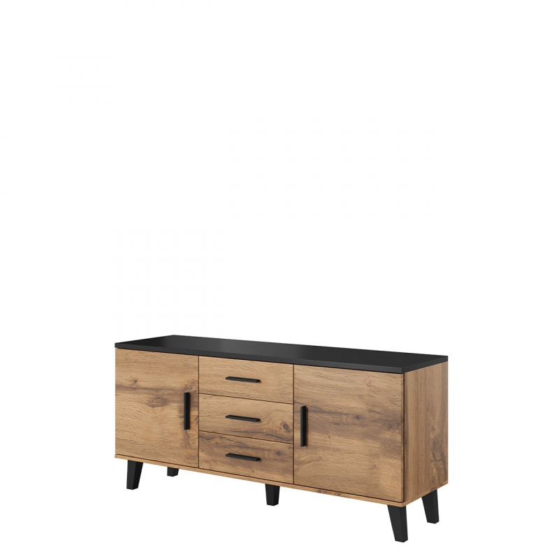 Komoda Sanna 150 2D3S je kombinací funkčního a nadčasového nábytku. Nabízené barvy si najdou své místo v moderních interiérech, ale také ty v loftovém či industriálním stylu. Vrchní deska je vyrobena z kvalitní matné desky, rukojeti a nohy jsou z mořeného dřeva.