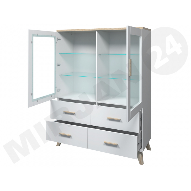 Vitrína ve skandinávském stylu je víceúčelový kus nábytku. V horní části je velký výstavní prostor. Prosklené přední strany umožňují vidět krystaly zasazené uvnitř, dekorativní sklo nebo porcelánové nádobí.