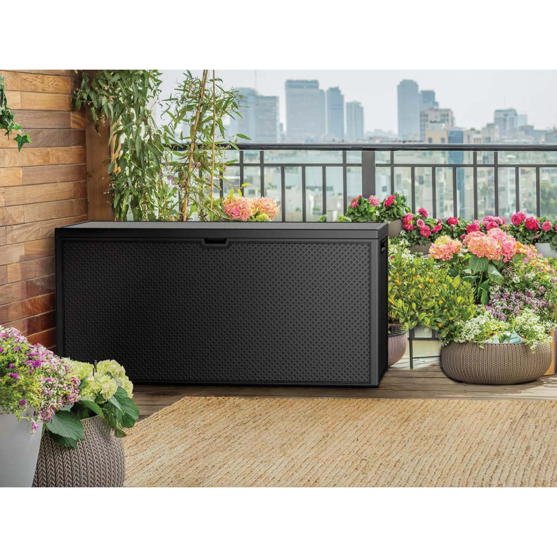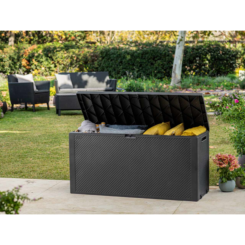 Zahradní box Flawian - jednoduchý způsob, jak uspořádat svou zahradu a terasu. Velká kapacita poskytuje optimální množství prostoru pro různé doplňky, nářadí a pomůcky potřebné pro péči o zahradu. Do zahradního boxu skryjete polštáře, hračky a přikrývky, čímž je ochráníte před deštěm a pripekajúcim sluncem.
