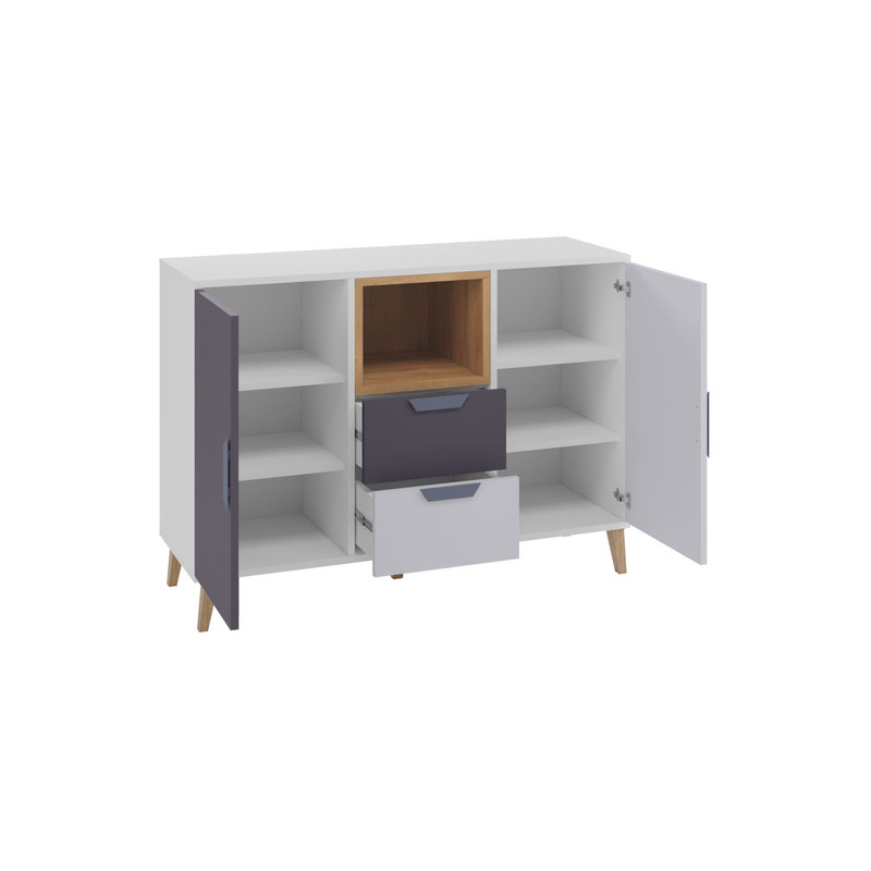 Úložný prostor poskytuje komoda, která disponuje skříňkami s policemi a dvěma šuplíky.