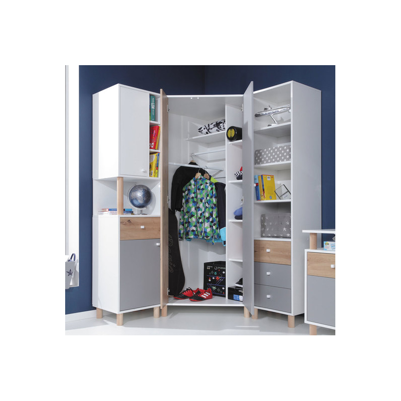 Hledáte univerzální sadu, která najde své místo prakticky v jakémkoli stylu interiéru? Spolehlivá volba pro vaše dítě? Produkty odolné, stylové a nadčasové? Pak je pro vás nábytek pro mládež Esponire II jako stvořený! V této sadě najdete tři knihovny a dvě skříňky, včetně jedné závěsné. Poskytnou vašemu dospívajícímu prostor pro školní věci, dekorace i oblečení. Rohová šatní skříň zabírá málo místa a má také několik tyčí, které usnadňují ukládání oblečení, například košil.