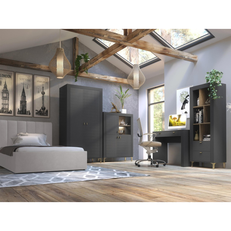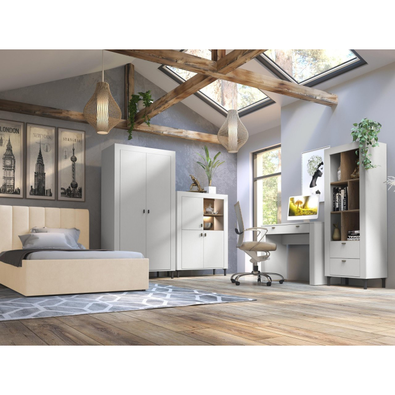 Prezentovaný dětský a mládežnický nábytek nabízí mnoho praktických prvků. Sestava obsahuje dvoudveřovou šatní skříň, polici, komodu, toaletní stolek se šuplíkem a postel. Další výhodou této moderní sestavy je, že některé její části jsou upevněny na vysokých nohách. Toto řešení znamená lehkost a bezproblémové udržování podlahy v čistotě.