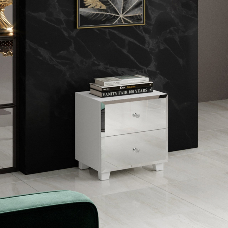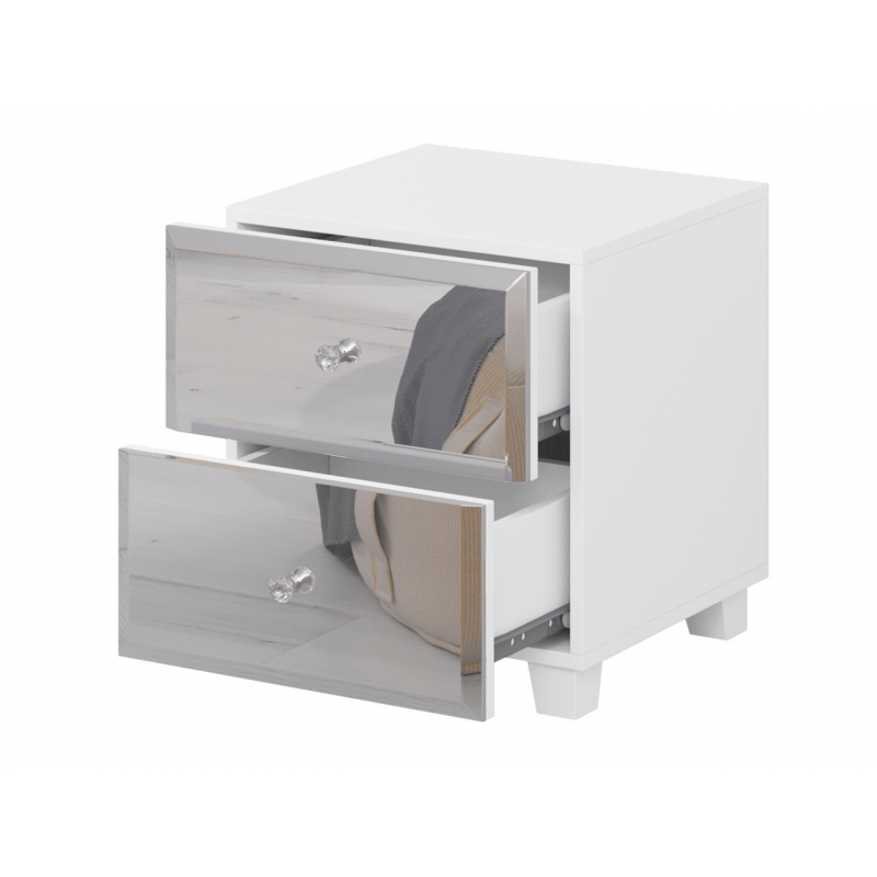 Stylový noční stolek se zrcadly na čelních stranách je nedílným doplňkem moderní ložnice, stejně jako té, která je zařízena v glamour stylu. Skromnou eleganci nočních stolků Solur zdůrazňují i malé úchytky ze skla.