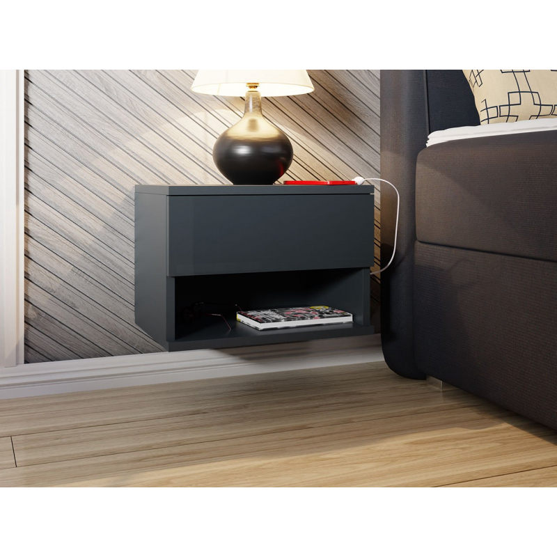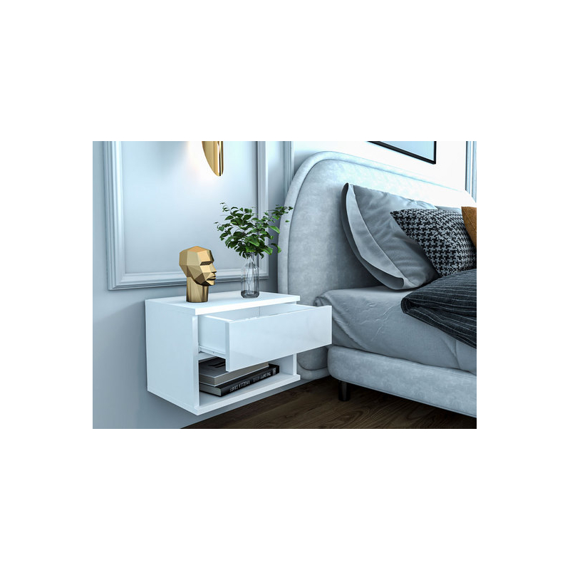 Noční stolek je neodmyslitelnou součástí každé ložnice. Nabízíme různá řešení a jedním z nich je také model Abercja. Díky minimalistickému vzhledu a nabízeným barvám se perfektně hodí do moderních interiérů. Noční stolek Abercja nabízí závěsný systém. Chybějící nožičky usnadní při úklidu přístup pod stolek a opticky zvětší prostor. Skříňka je vybavena výsuvnou zásuvkou a otevřenou policí. Povrch vrchní desky stolu je 45 cm x 32 cm.