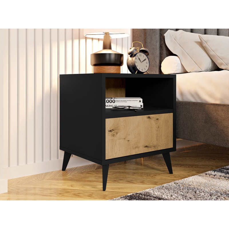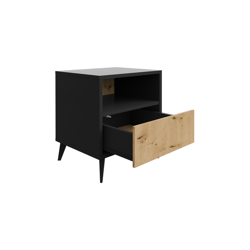 Model nabízí tři malé prostory. První z nich je vrchní deska, která je základem pro věci, které se vyplatí mít rychle po ruce. Druhá je otevřená police, ideální na knihy. Třetí plocha je zásuvka, kam schováte vše, co by nemělo být vidět. Noční stolek je upevněn na praktických nohách, které zdůrazňují jeho zajímavý charakter a usnadňují jeho udržování v čistotě. Mimořádně praktickým řešením je také systém otevírání push to open.