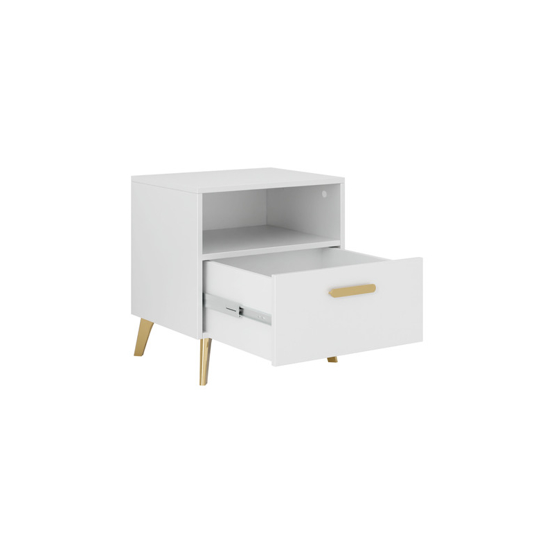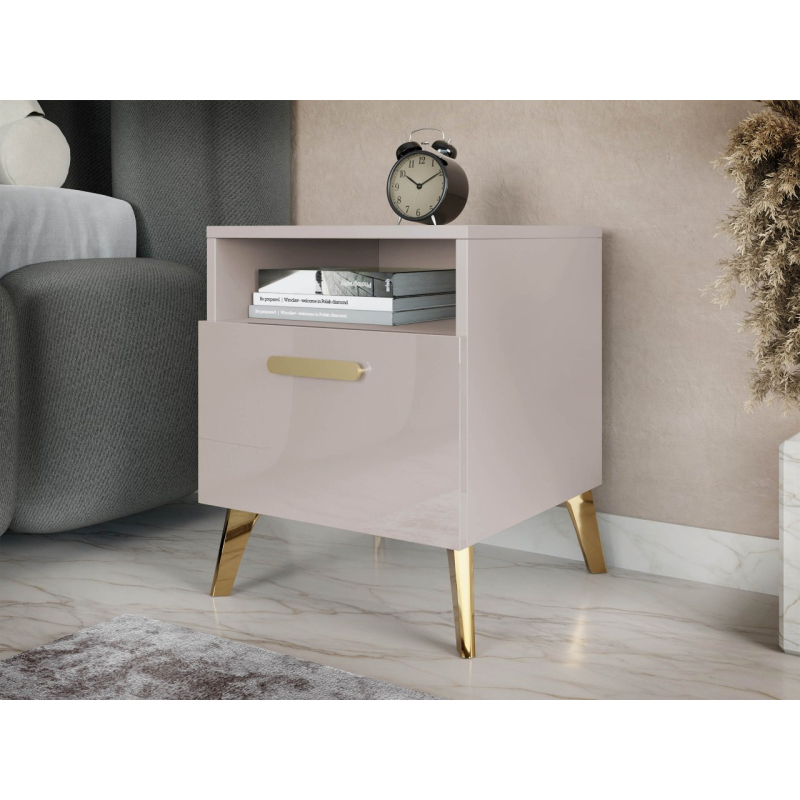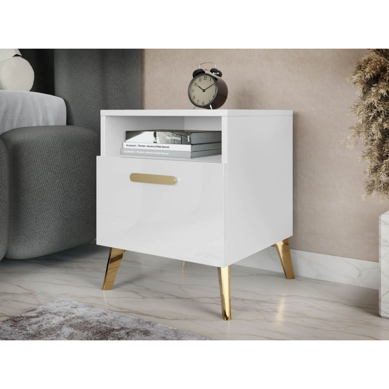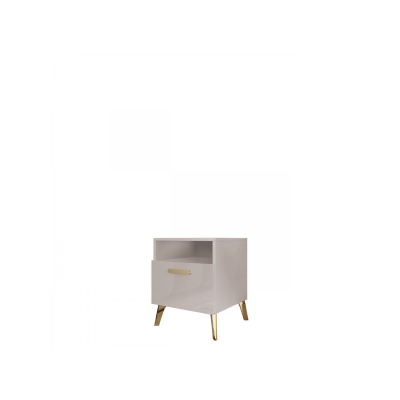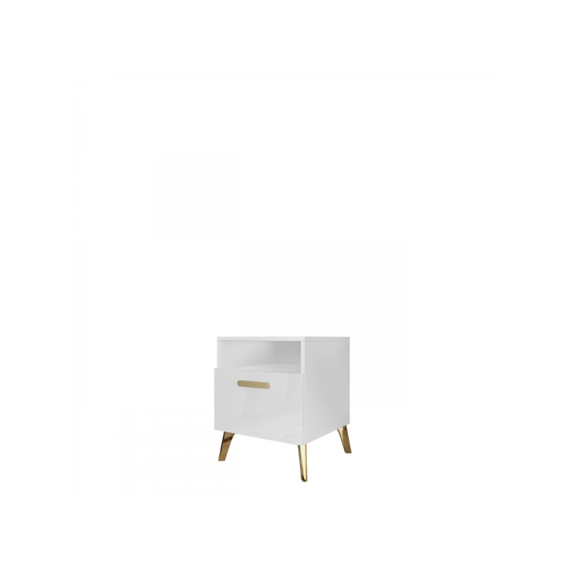 Dodejte své ložnici funkčnost přidáním malého prvku hned vedle postele. Noční stolek se šuplíkem Rostiw 1SZ je spojením moderního stylu a praktičnosti. Jednoduchý tvar vyvýšený na lesklých zlatých nožičkách bude skvělým doplňkem do ložnice, dodá prostoru třídu a prestiž. Nábytek má lesklá čela, což dodává celku luxusní charakter.