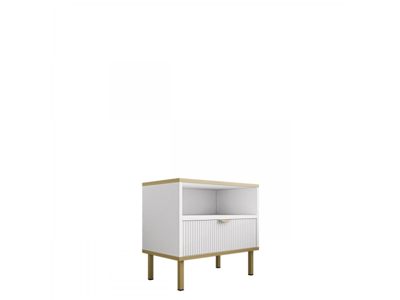 Moderní vzhled stolku zvýrazňuje přední plocha s drážkami a stylová zlatá úchytka, která dodávají celku nádech elegance.