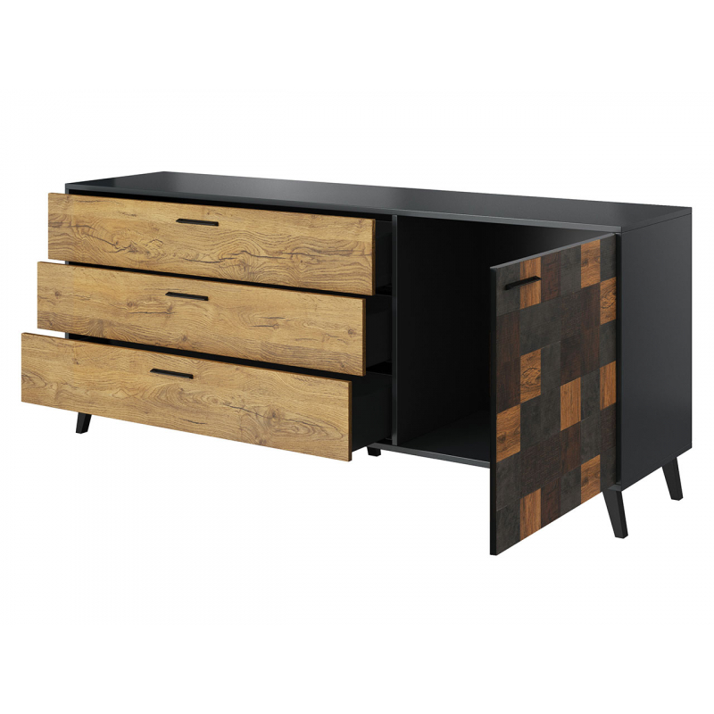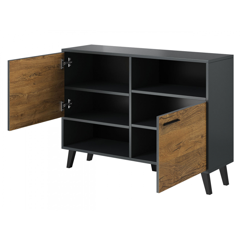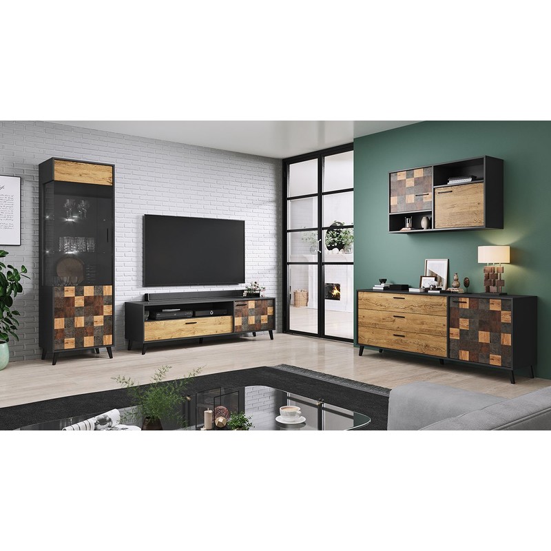 Plánujete vyzdobit obývací pokoj v moderním stylu s nádechem industriálního charakteru? Pokud ano, máme pro vás vynikající nabídku! Nábytek do obývacího pokoje Niki I! Kolekce se vyznačuje zajímavou barevnou kombinací, která obsahuje několik odstínů imitací dřeva. Použité barvy vytvářejí účinný design na přední straně skříně.