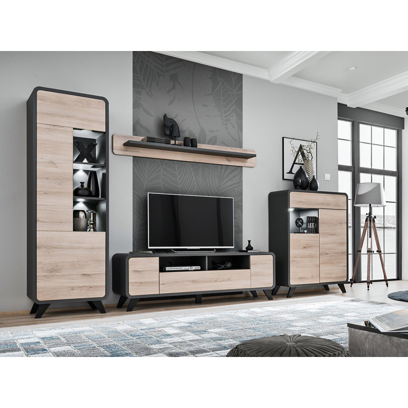 Sestava obsahuje prostorné vitríny různých velikostí, nadčasovou nástěnnou poličku a funkční televizní skříňku, která skvěle zobrazí elektronické vybavení.