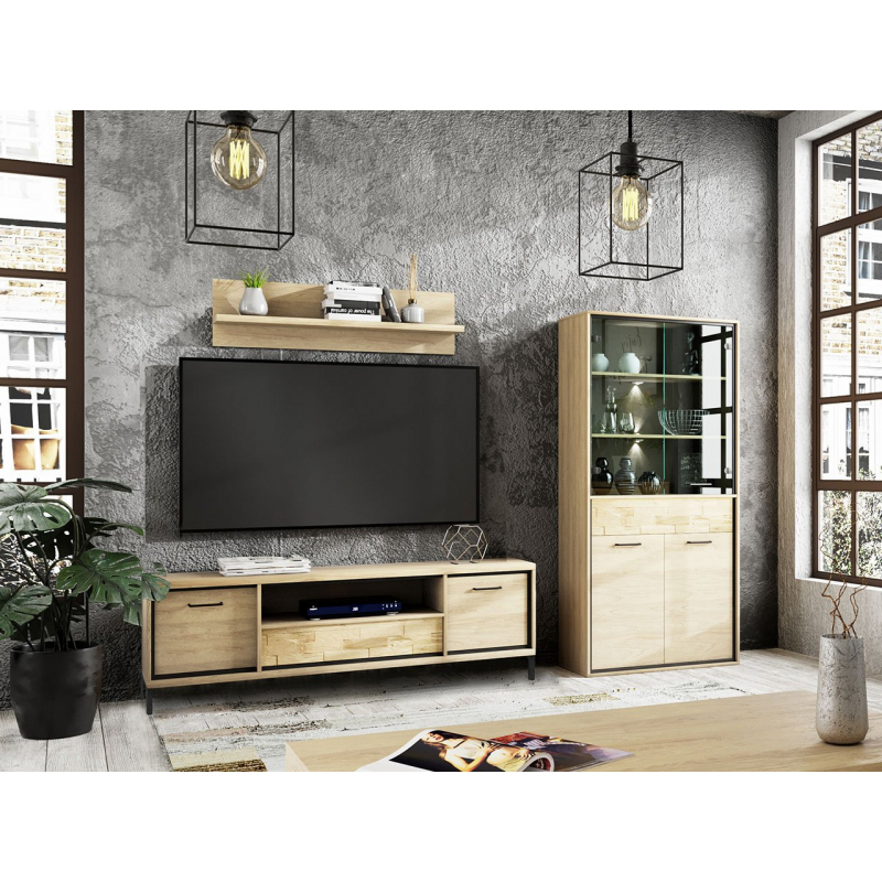 Industriální charakter interiéru obývacího pokoje zvýrazní sestava pokojového nábytku Sarged. Charakteristickým znakem soupravy je jednoduchá forma, decentní dekory i dřevitá barevnost.
