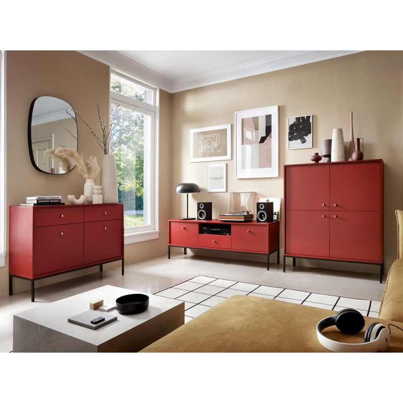 Kovové nožičky jsou nejen nejmódnější stabilní základnou nábytku, ale také velkým pohodlím při vysávání podlahy díky snadnému přístupu pod nábytek. Sestava nábytku do obývacího pokoje je doplněna o detail v podobě minimalistických roztomilých úchytek.