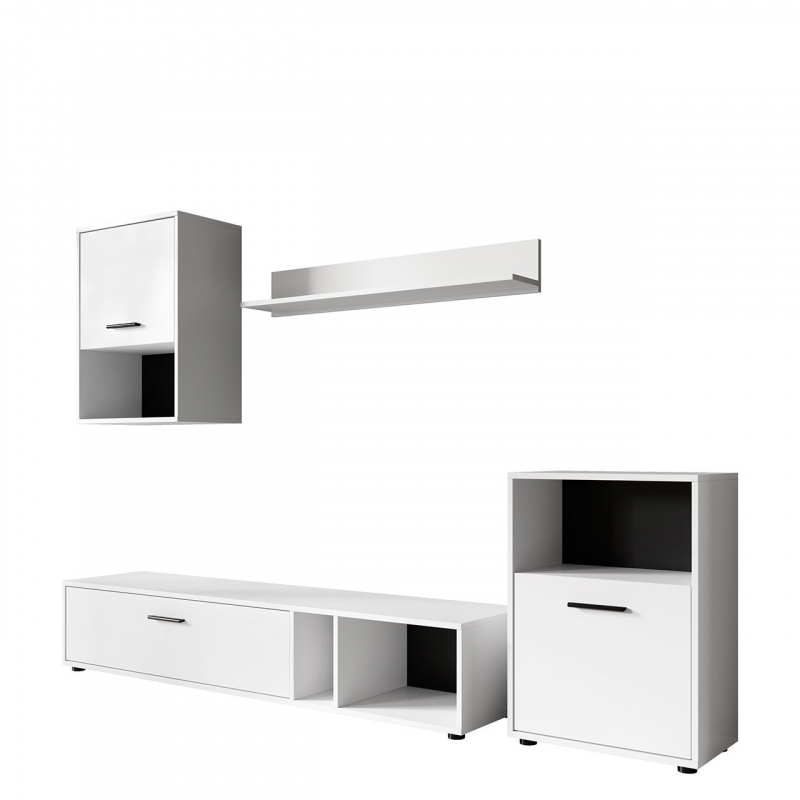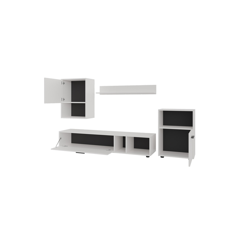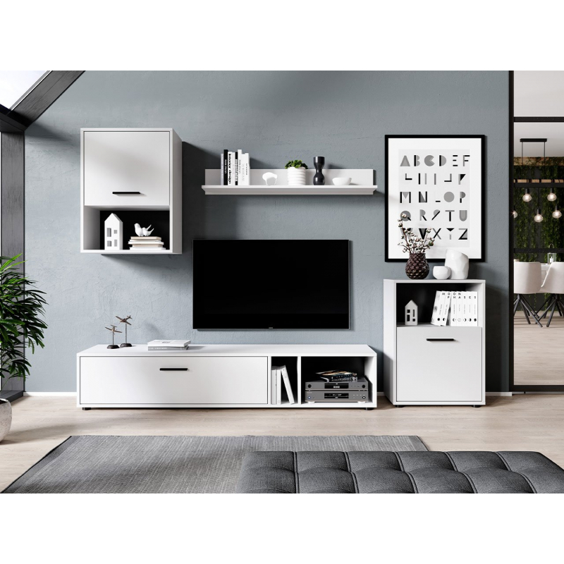 Základem sestavy je stojící TV skříňka, jejíž výhodou jsou prostorné přihrádky pro uložení TV příslušenství. Skříňky k němu připevněné - závěsné a stojící zvětšují úložný prostor. Každý z nich má navíc i otevřenou polici na vystavení drobností. Součástí nástěnné jednotky Ingvare je i podlouhlá závěsná police - malý detail, který zkrášluje aranžmá.