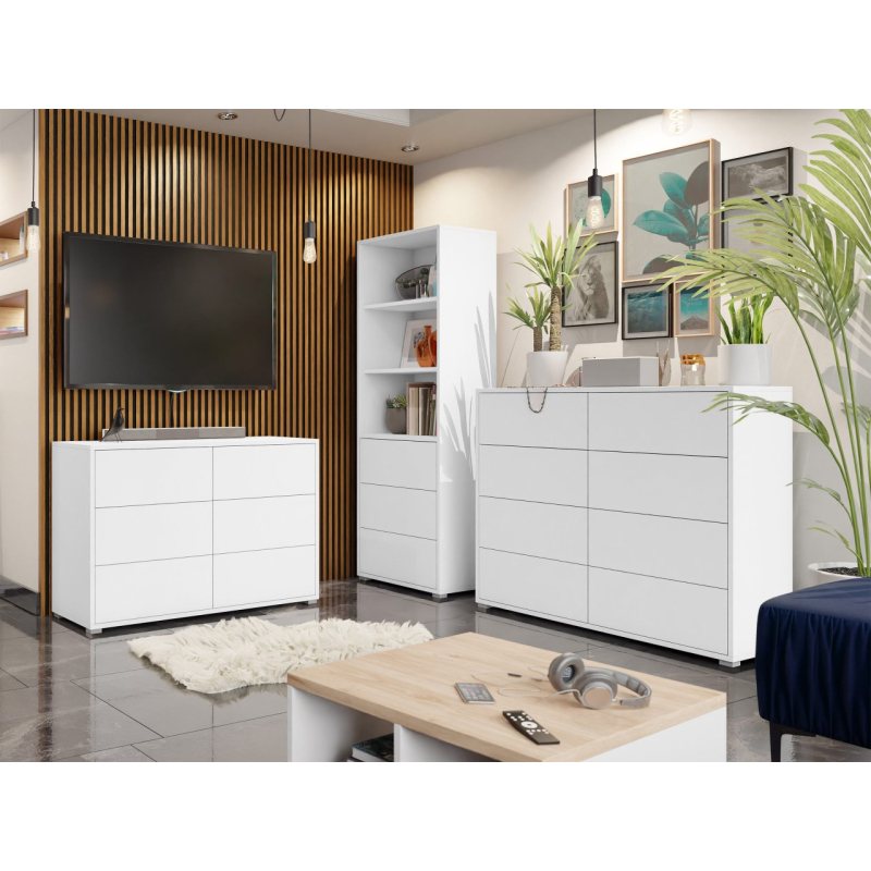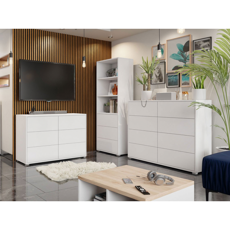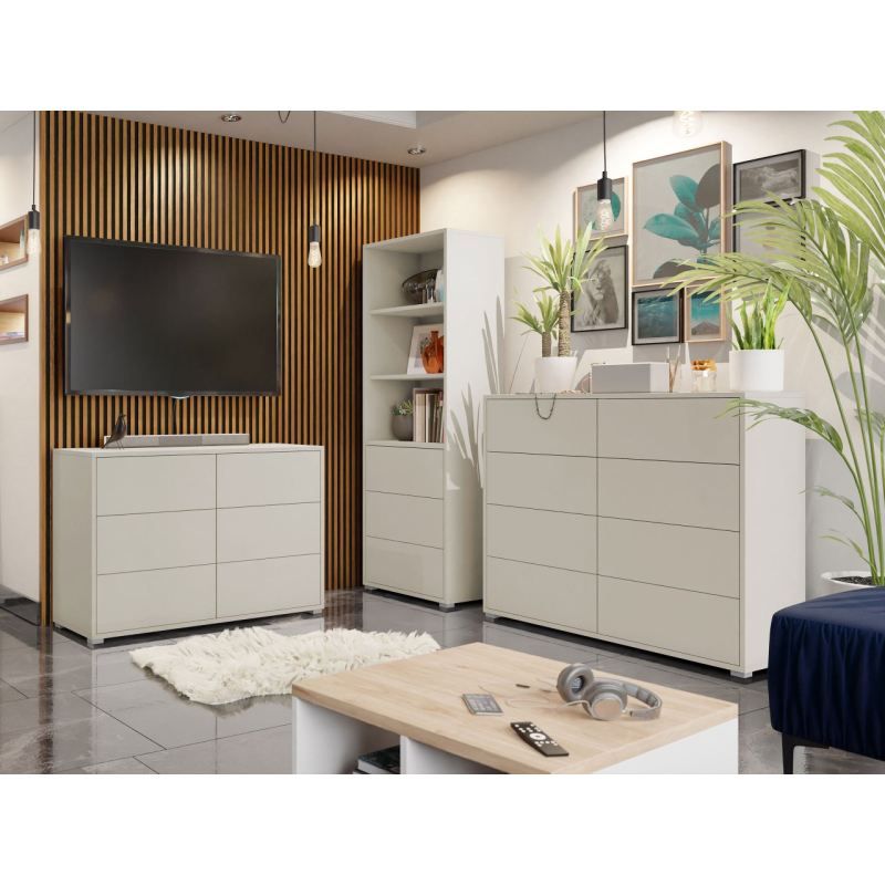 Moderní obývací sestava Alekto je ideální sestavou pro malý i velký obývací pokoj. Kombinace světlých barev s minimalistickou formou dodává místnosti prostor a opticky zlepšuje její proporce. Čelní strany bez úchytek zvyšují estetiku soupravy a systém push to open usnadňuje každodenní otevírání a zavírání každé zásuvky.