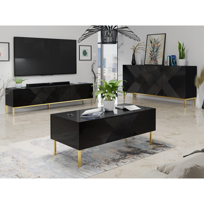 Souprava nábytku obsahuje komodu, konferenční stolek a skříňku pod televizi. Každý kus má lesklé, frézované přední strany. Nabízí také úložný prostor. Modely stojí na zlatém kovovém rámu, který celek dokonale doplňuje. Nabízí také možnost důkladně vyčistit podlahu.