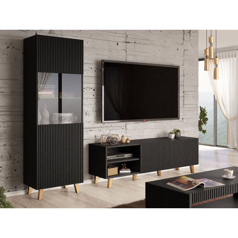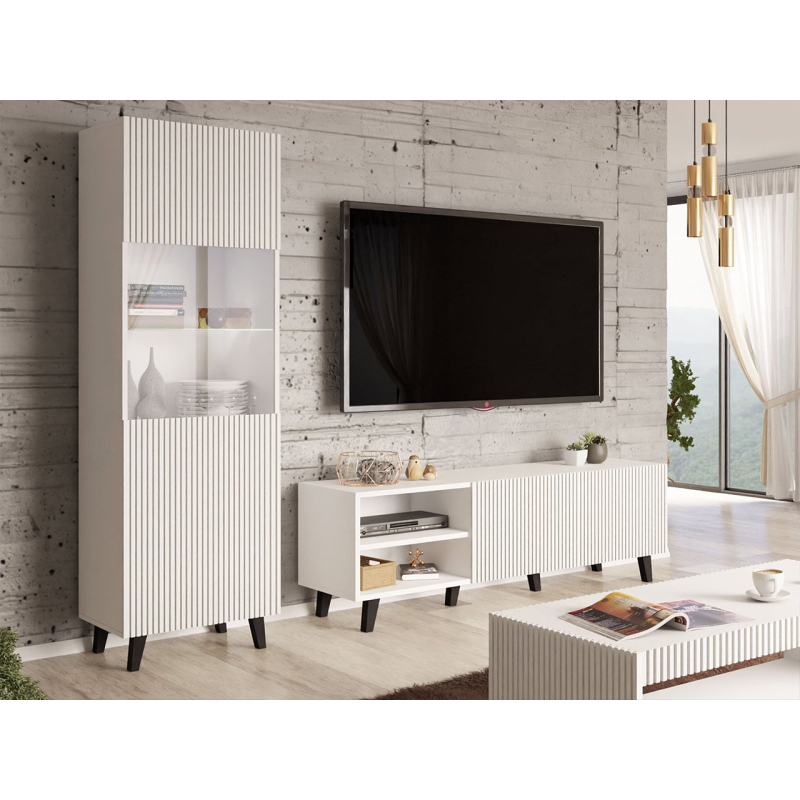Sestava nabízí vitrínu s tvrzeným sklem a TV skříňku, u které si o vzhledu modelu rozhodnete již ve fázi montáže. Varianty jsou usazeny na nožičkách, což usnadňuje úklid podlahy. Prezentovaný pokojový nábytek nemá žádné úchytky a otevírání je možné díky čelům mírně vystupujícím nad vrchní desku.