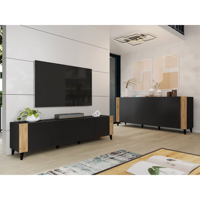 Sestava nábytku do obývacího pokoje Ezrunis I je komplet, který se bude krásně vyjímat v každém prostoru. Zajímavý design obohatí interiér a vytvoří praktickou zónu pro uložení multimediálního vybavení nebo oblečení. S touto sestavou vytvoříte ve svém domově přátelskou a uspořádanou zónu.