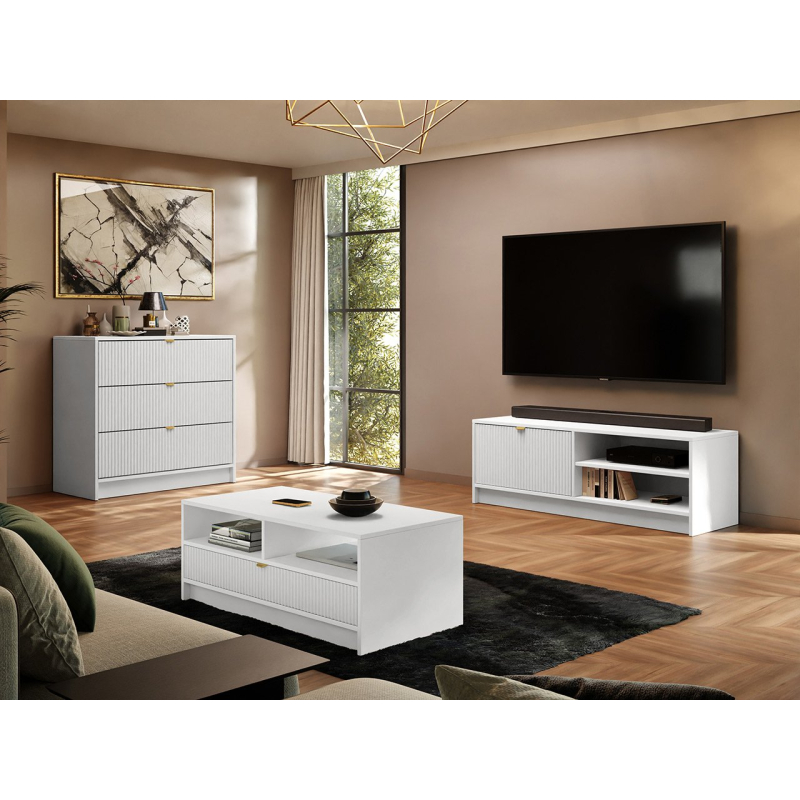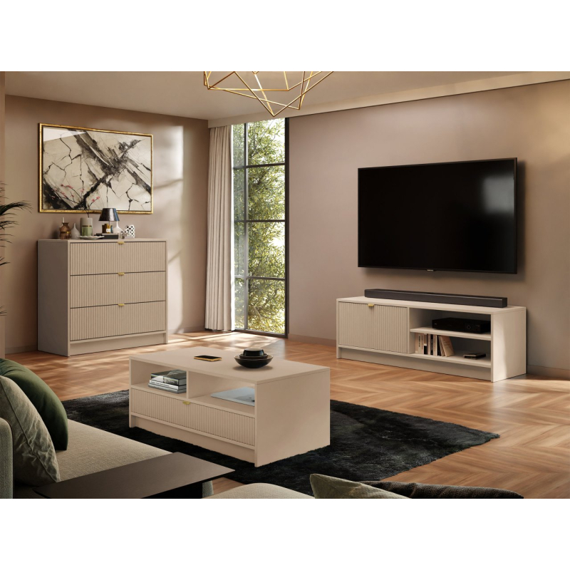 Minimalistický design TV skříňky dokonale ladí s ostatními prvky sestavy. Komoda vám pomůže uspořádat spodní prádlo, doplňky a dokumenty. Frézovaná čela vypadají neuvěřitelně stylově a tvoří elegantní dekorativní akcent obývacího pokoje.