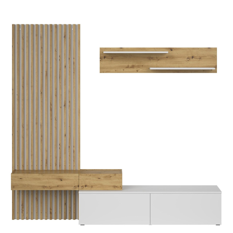 Moderní obývací stěna do obývacího pokoje je vybavena prostornými úložnými přihrádkami. e zajištěn pohodlný úložný prostor pro knihy, elektronická zařízení nebo časopisy. Pokud si ceníte pořádku a estetiky ve svém okolí – je to pro vás ideální volba! Navíc má varianta bezúchytkový systém otevírání. "PUSH TO OPEN". Dodává skříňkám minimalismus a otevírání je pohodlné.
