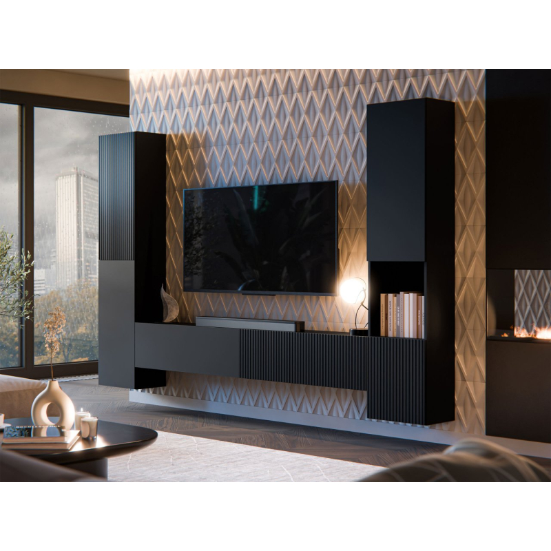 Nábytek do obývacího pokoje Bamali I je elegantní kombinací, která poskytuje neuvěřitelnou funkčnost. Perfektní nápad na multimediální stěnu. Dvě vitríny v kombinaci s televizní skříňkou vytvářejí velkolepý vizuální efekt. Nábytek má minimalistický tvar obohacený o módní drážky. To dodává celému projektu moderní charakter.