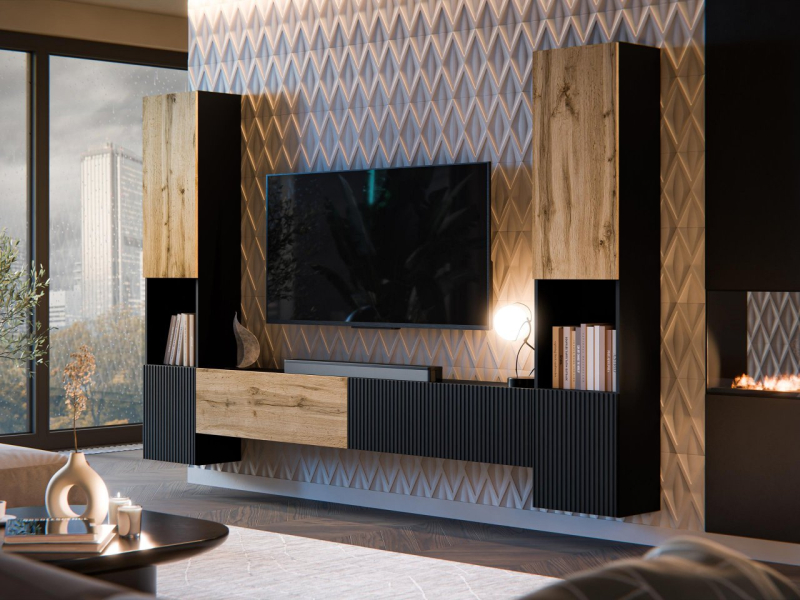 Vkusný styl nábytku do obývacího pokoje je umocněn jednotným barevným schématem a precizním propracováním detailů. Úprava hran a textura předních částí hovoří o důkladné pozornosti věnované detailům.