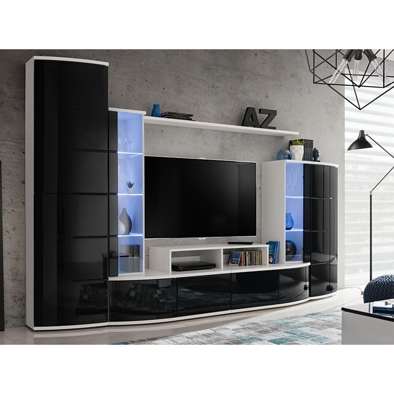 Kier je obývací stěna s moderním designem. Má lesklé čelní plochy a charakteristické mírně zaoblené bloky.