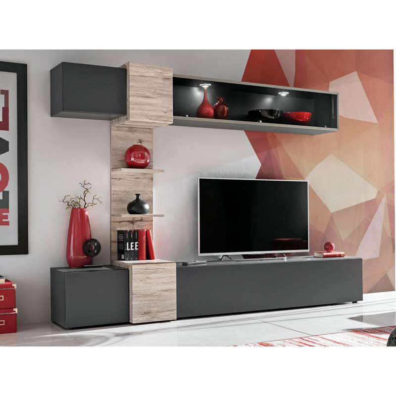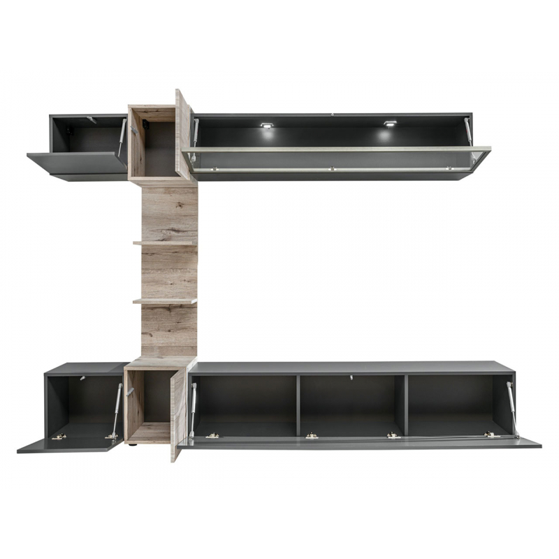 Obě části obývací stěny jsou spojeny úzkým stěnovým panelem, který poskytuje další police.