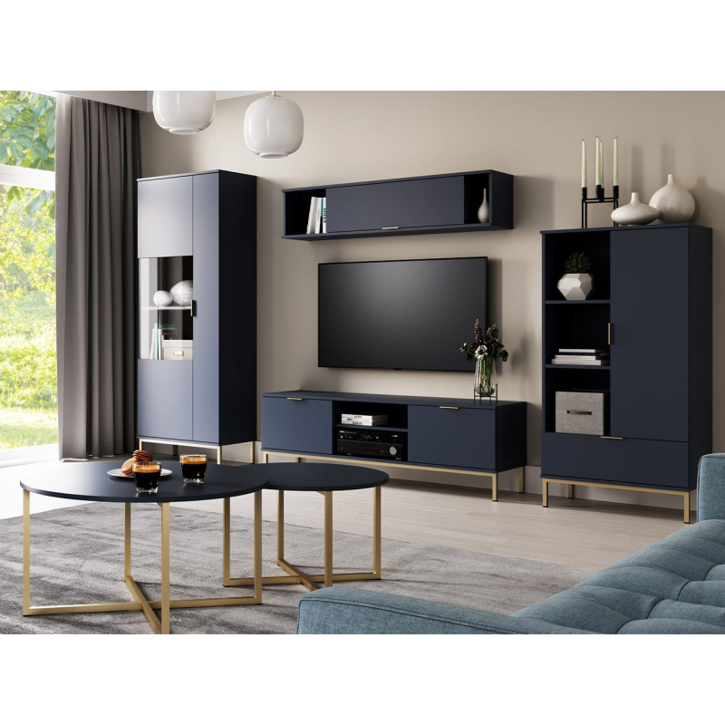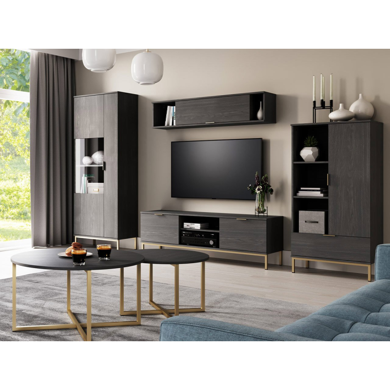 Elegantní nábytek do obývacího pokoje Finoti II je zajímavou nabídkou pro moderní aranžmá. Kombinace tmavých barev se zlatým základem v podobě kovových nožiček dodá osobitý vzhled každému interiéru.