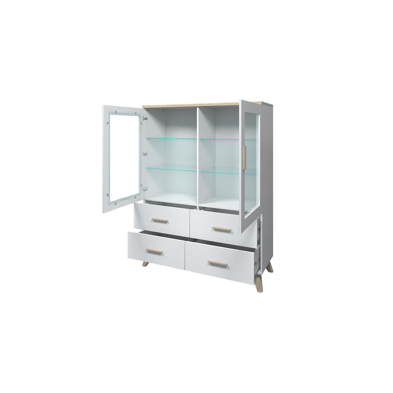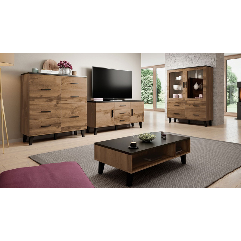 Sada obsahuje řadu nejnutnějších prvků vybavení obytného prostoru. Základem je komoda pod TV, která spolu s prosklenou vitrínou a prostornou komodou má na starosti praktické uložení věcí, které se v obýváku hromadí. Sedací část zase doplňuje konferenční stolek s policemi pod stolovou deskou.