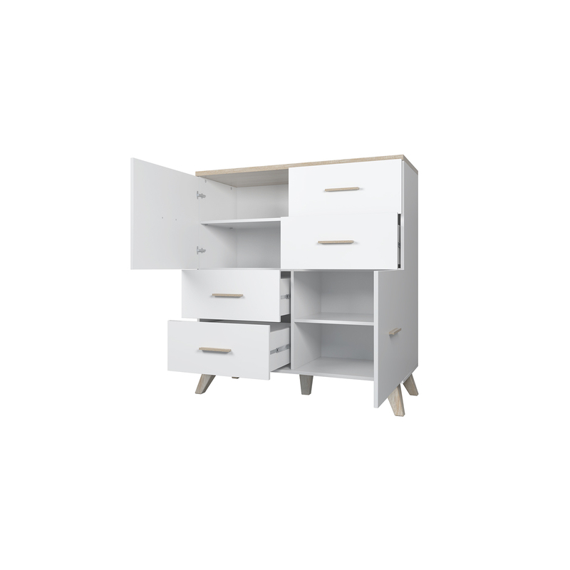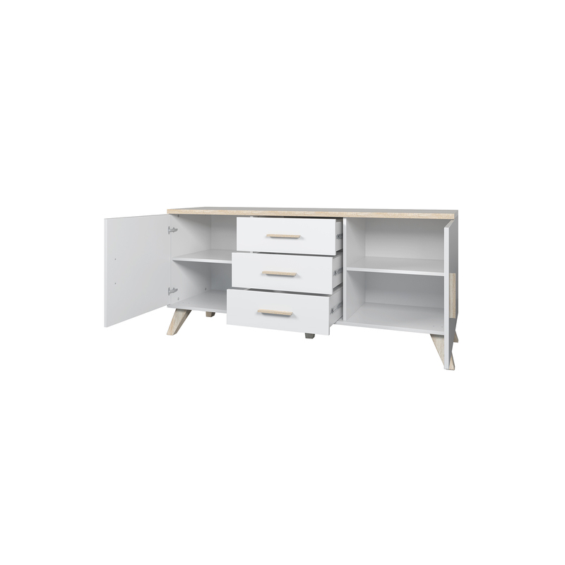 Sestava nábytku do obývacího pokoje Sanna dodá dekoraci celé místnosti skandinávský charakter. Nejmódnější barvy čel v kombinaci s geometrickými tvary zdobí obývací pokoj v dobrém stylu, který do něj vnáší i tón harmonie a útulnosti. Celek je osazen na mírně prodloužených nožičkách, které dodávají každému kusu nábytku optický dojem lehkosti.