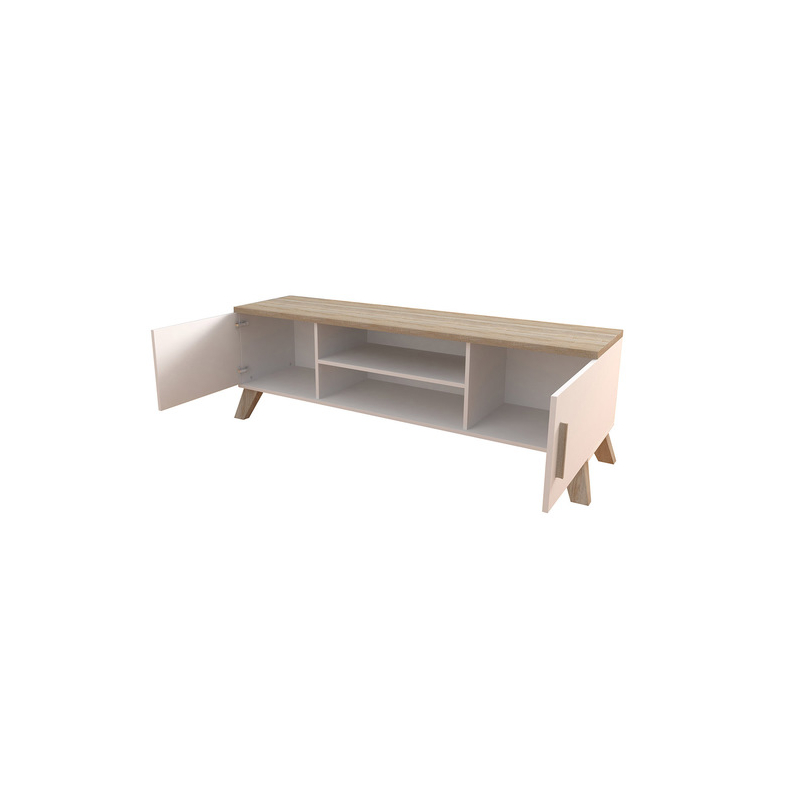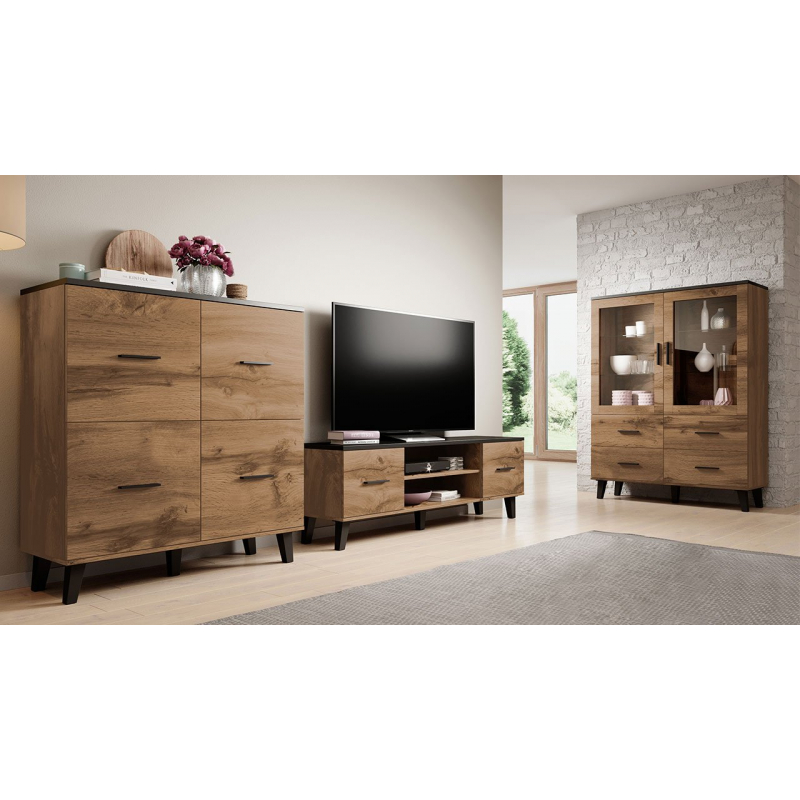 Nábytková sestava Sanna kombinuje TV skříňku s prostornou komodou a stojící vitrínou. Prosklená dvířka vitríny zatraktivňují dekorace uvnitř. Četné police uvnitř komody zase dokonale pořádají úložný prostor v obývacím pokoji. Předností TV skříňky jsou prostorné police věnované elektronice, jakož i diskrétní prostor pro TV příslušenství.