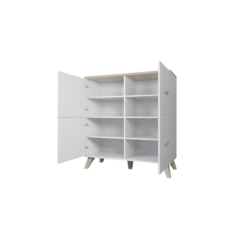 Skandinávské rysy pokojového nábytku Sanna II poznáte podle jednoduchosti a neutrální barvy čel. Minimalistické tvary zdobí jen prodloužené úchyty, stolové desky a nohy v barvě kontrastující se zbytkem nábytku. Úkolem mírně prodloužených nohou je dodat každé komodě stabilitu a zároveň umocnit dojem lehkosti, kterou místnosti dodávají.