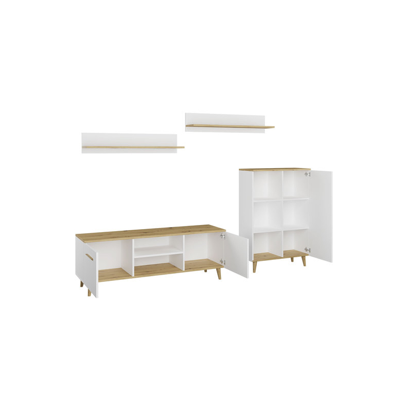 Do skříně RTV se kromě televizního vybavení vejdou CD, kabely, dálkové ovladače a další nepotřebné předměty. Soupravu doplňují dvě závěsné police, na kterých si můžete vystavit oblíbené rodinné fotografie nebo suvenýry z dovolené.