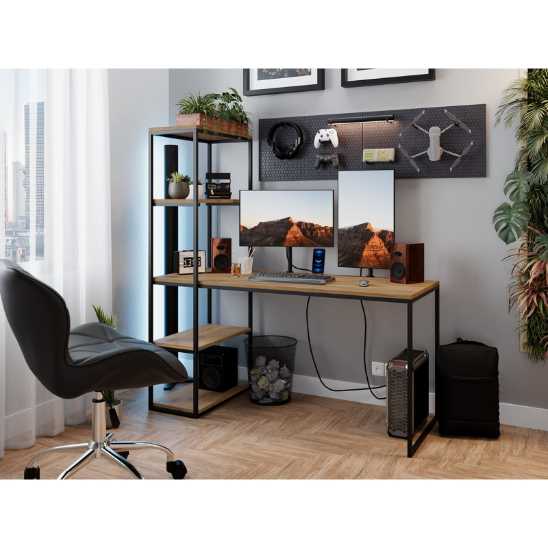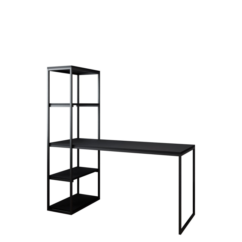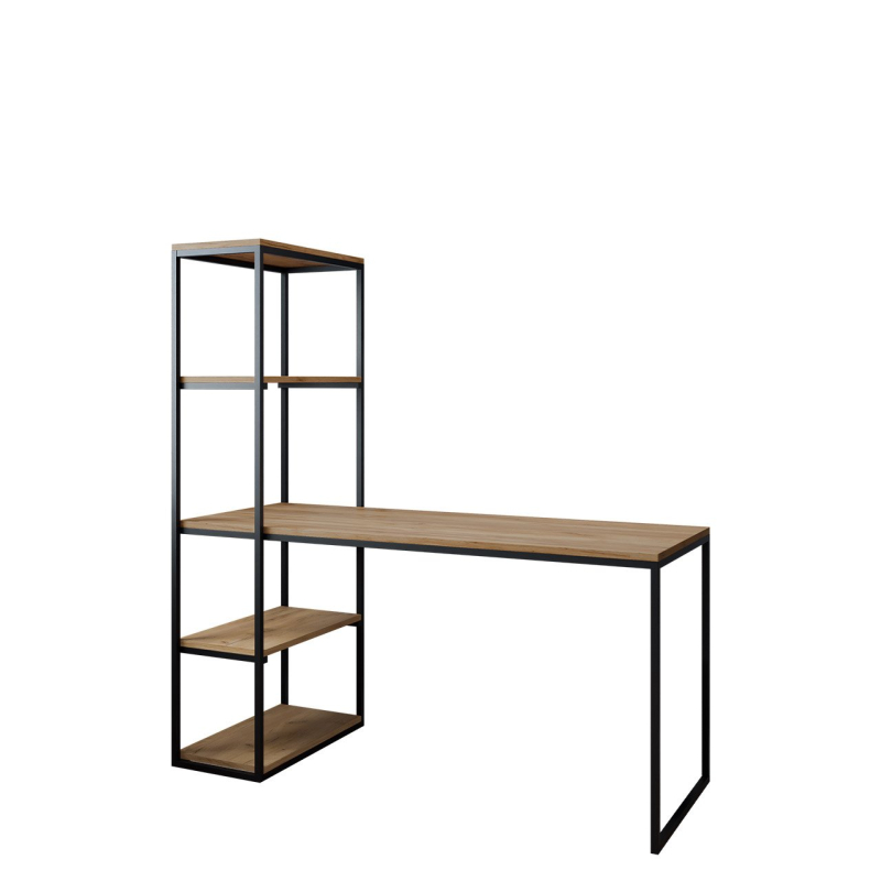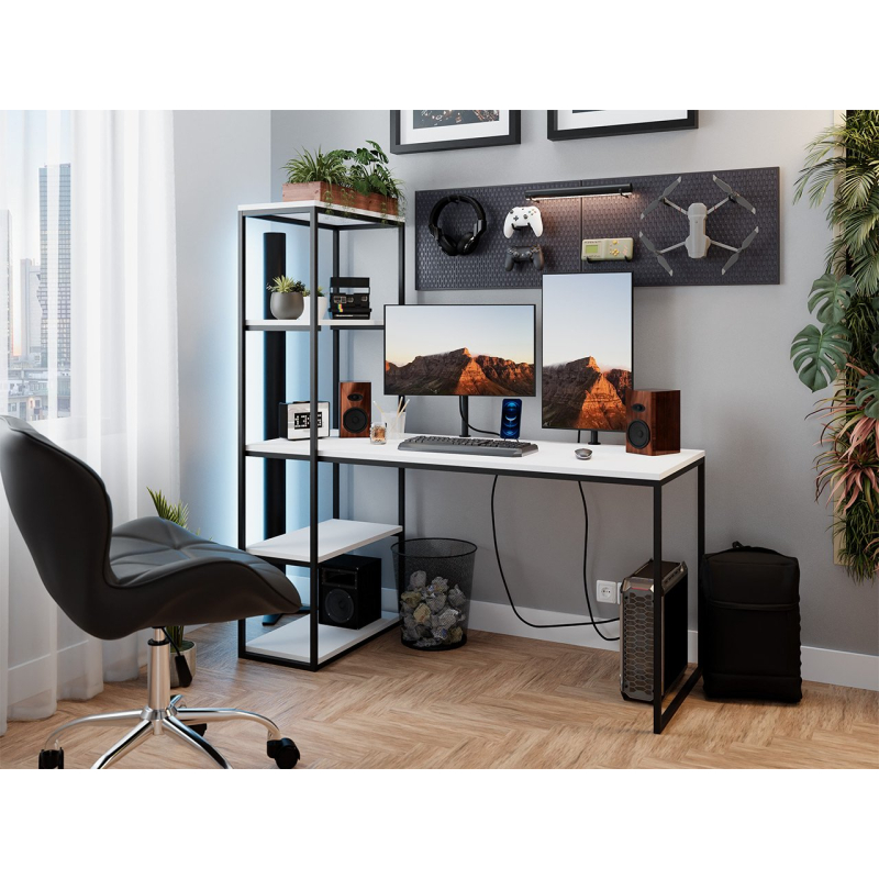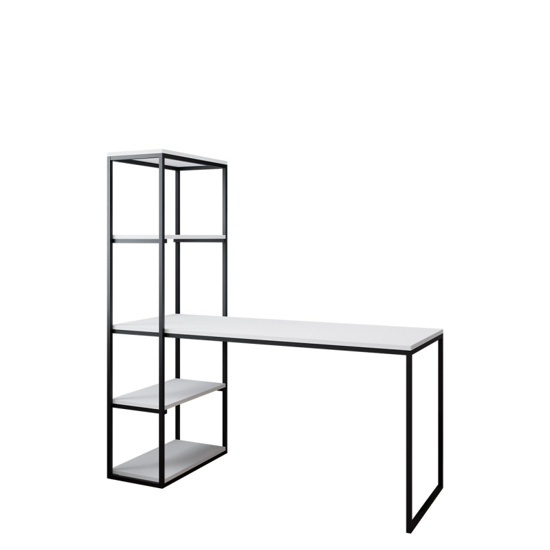 Psací stůl s knihovnou má několik polic, do kterých můžete umístit knihy, dokumenty, ozdoby nebo jiné potřebné věci pro práci nebo studium. Nábytek se vyznačuje pevnou konstrukcí navrženou z odolných materiálů. Vrchní deska stolu je vyrobena z laminované desky, která je odolná proti poškrábání a snadno se čistí. V kombinaci s kovovým rámem dodává celkovému designu netradiční styl.