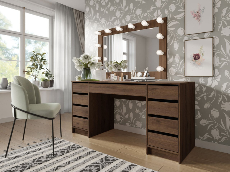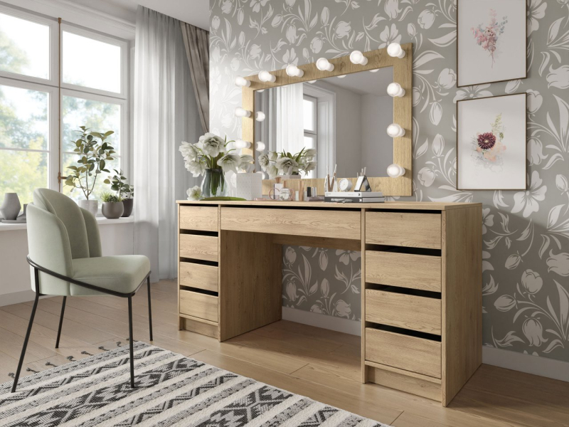 Množství prostorných zásuvek umístěných po obou stranách toaletního stolku pomáhá organizovat kosmetiku a doplňky, jakož i dokumenty a učební pomůcky. Moderní charakter psacího stolu se šuplíky zapadne téměř do každého aranžmá!