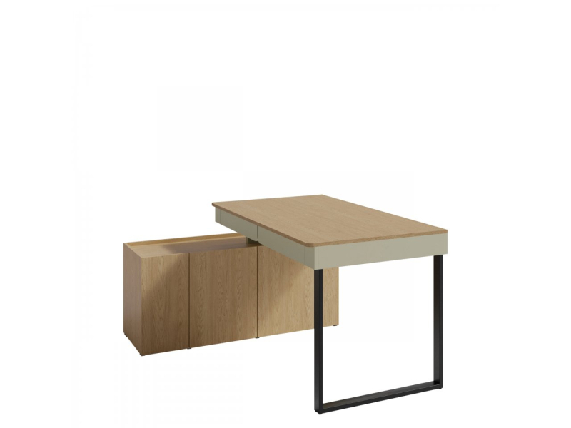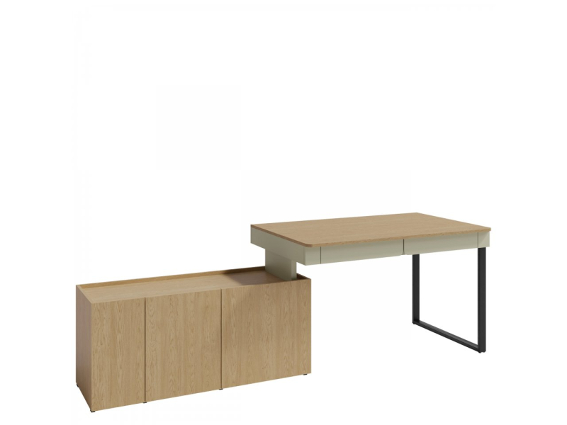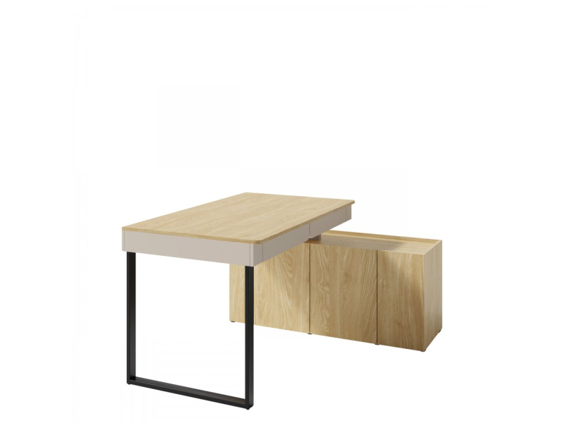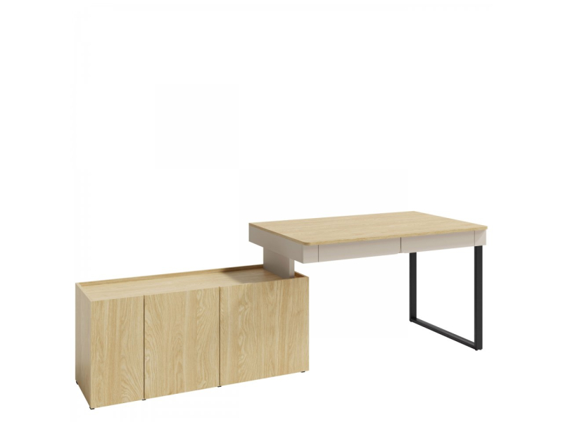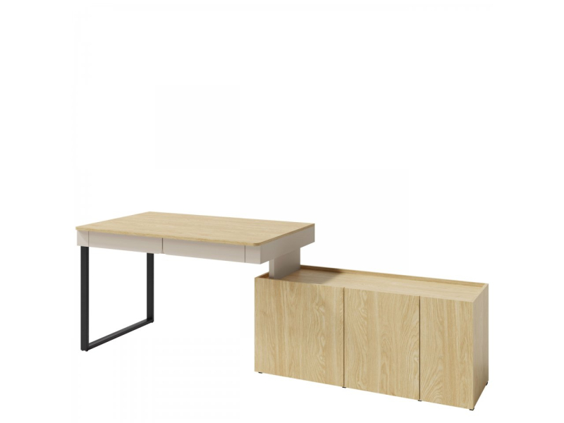 Objevte mládežnický psací stůl Cubonis CB10. Tento zajímavý koncept se vyznačuje minimalistickým designem bez úchytek. Dvířka se otevírají přes čelní stranu, která mírně vyčnívá nad desku stolu, zatímco zásuvky mají praktické úchytky. Černé kovové nohy zajišťují strukturální stabilitu.