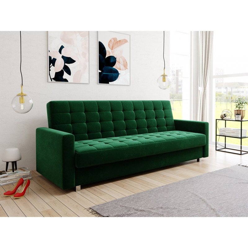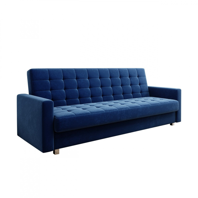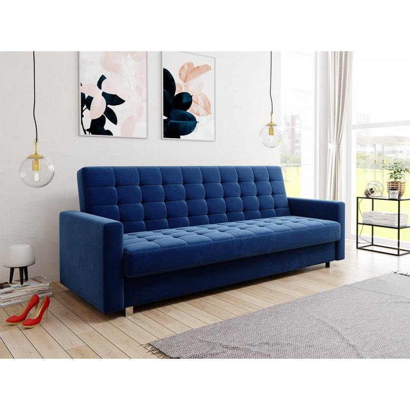 Rozkládací pohovka Pomerania je model, který se dokonale hodí k moderním interiérem. Charakteristickým znakem pohovky je ozdobné prošívání aplikované na opěradlo a sedadlo. Dalším ozdobným prvkem jsou kovové nohy z chromu. Celek je doplněn sametovou tkaninou, která je hitem současných trendů interiérového designu.
