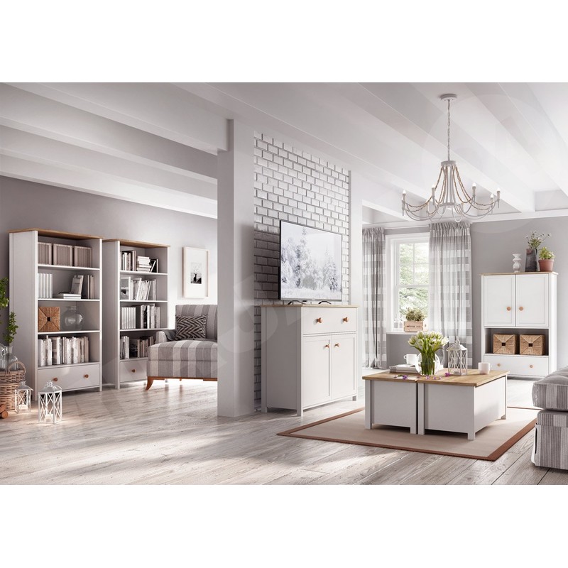 Nábytek do obývacího pokoje Story se skládá z několika prvků. První z nich je vysoký regál s policemi a zásuvkou. Díky tomu můžete ve svém obývacím pokoji vytvořit fantastickou knihovnu.
