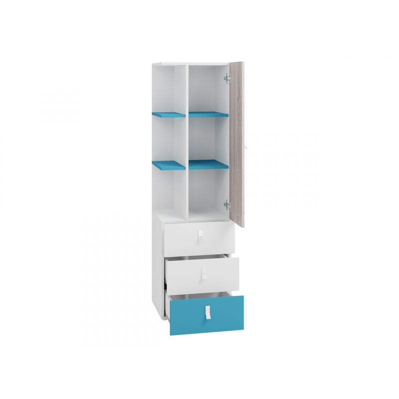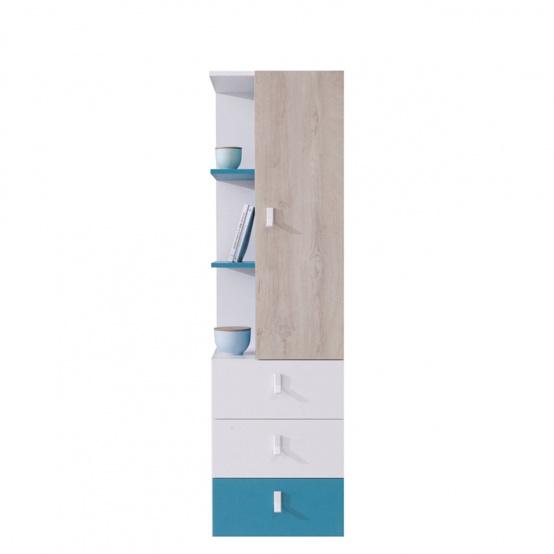 Prostorný regál pro děti Legimi představuje vyšší úložný prostor. Kombinace hlubokých zásuvek a uzavřené skříňky poskytuje mnoho prostoru pro různé položky.