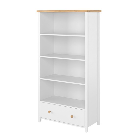 Otevřená knihovna s zásuvkou 1S Story SR02 vypadá jemně as nádechem romantiky. Je ovlivněna kombinací bílé s dřevěným přízvukem a kulatými držadly použitými na zásuvce. Kromě zásuvky má knihovna také čtyři otevřené police. Ideální pro ukládání knih!