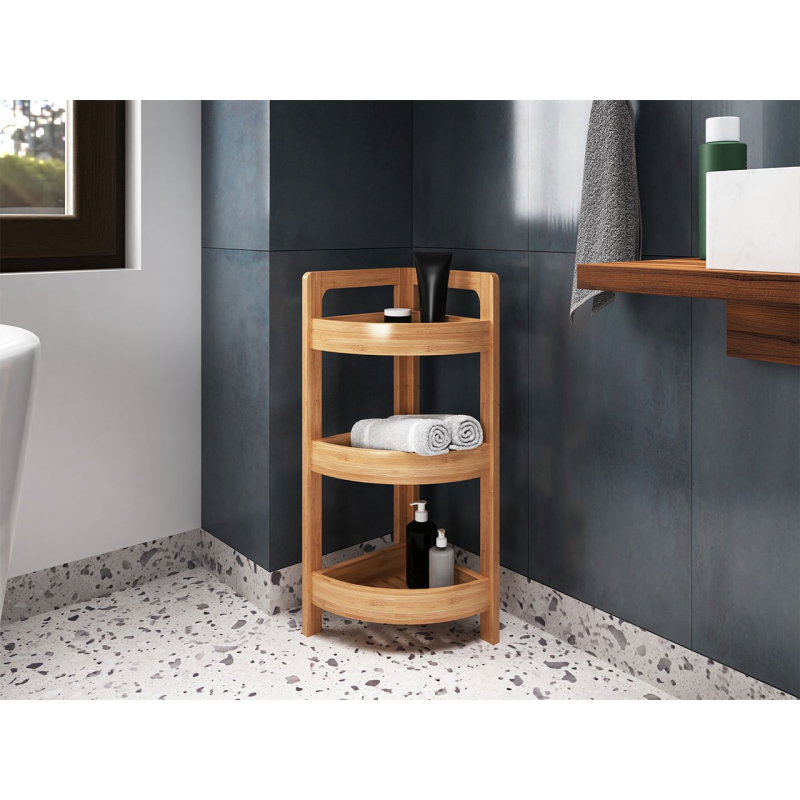 Bambusový koupelnový regál Joelli je praktickým a stylovým řešením. Dodá eleganci a funkčnost každé koupelně. Díky vysoké kvalitě bambusového dřeva je odolný a estetický. Tři police nabízejí dostatek úložného prostoru pro různé koupelnové předměty, od ručníků po kosmetiku. Police je vzhledově atraktivní a zapadá do nejnovějších designových trendů. Jedná se o praktický kus vybavení, který usnadňuje každodenní používání. Přirozená barva navíc dodává lehkost a jemný šarm, což jí umožňuje dokonale ladit s různými styly interiéru.