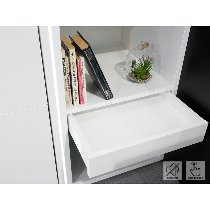 Interiér skříňky je vybaven několika prostornými policemi a jednou zásuvkou. Pokud vedle postele umístíte skříňku, může také fungovat jako noční stolek. Skříňka je k dispozici ve čtyřech barvách. Skříňka má navíc tiché zavírání a dveře skříně jsou univerzální a můžete je namontovat vpravo nebo vlevo. Skříňka je vybavena otevíracím systémem PUSH TO OPEN.