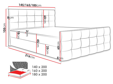 hloubka: 216 cm, šířka: 145 cm, výška: 105 cm, plocha na spaní: 140 x 200 cm,